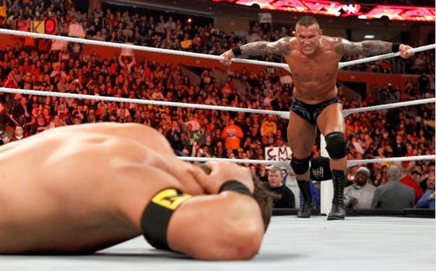 و بهذه الحركة ذا روك يسيطر على الامور و يبدو انه حان دور حركة بيبول البو و ذا روك يتجه الى الحبال و راندي اورتن يقف و يفاجأ ذا روك بحركة ار كي او