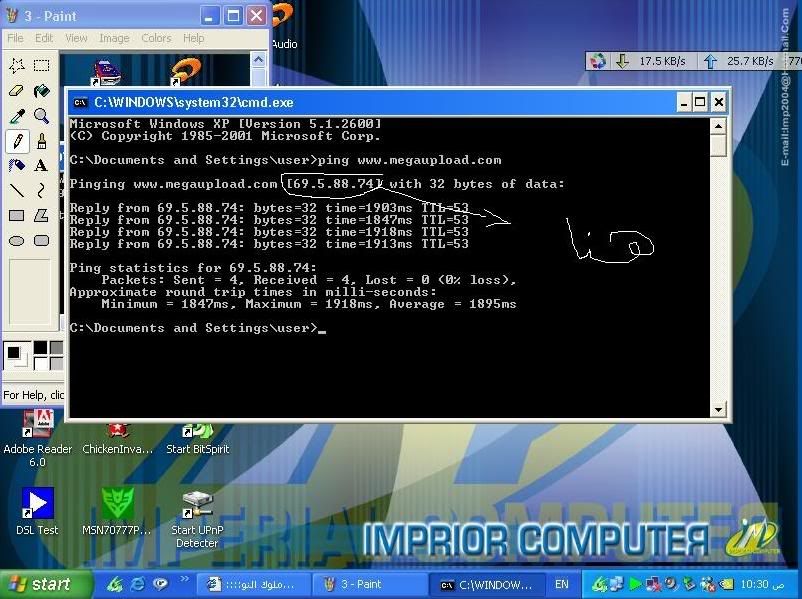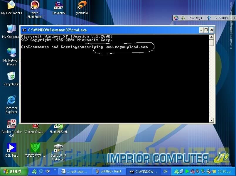 ونكتب في شاشة الأومار السوداء هذا الأمر ... ping www.megaupload.com ونضغط انتر