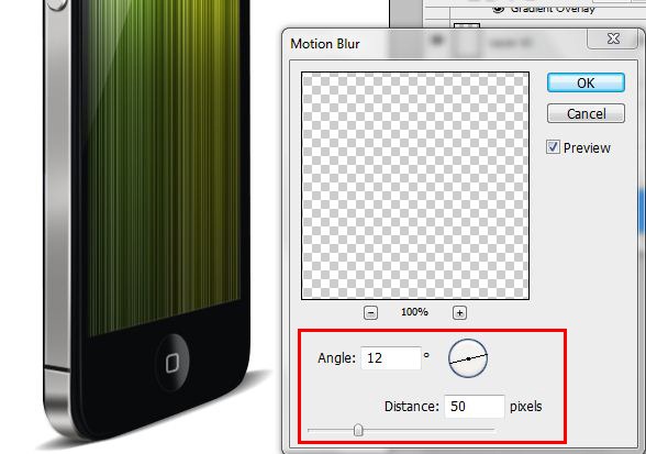 - نطبق Filter > Bur > Motion Blur ونضع هذه الاعدادات