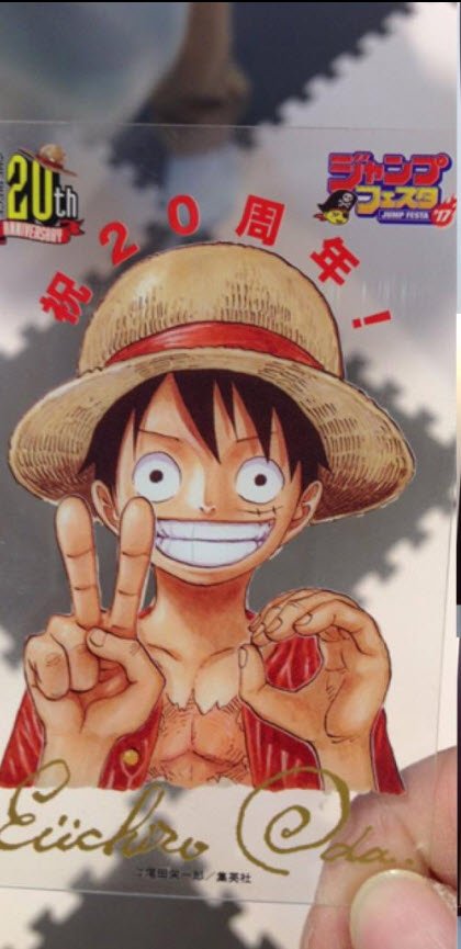 توقيع Oda بمناسبة الذكرى 20 في Jump Festa , جعل لوفي يشكل رقم 20 بأصابع اليد مع تواجد توقيعه بالأسفل